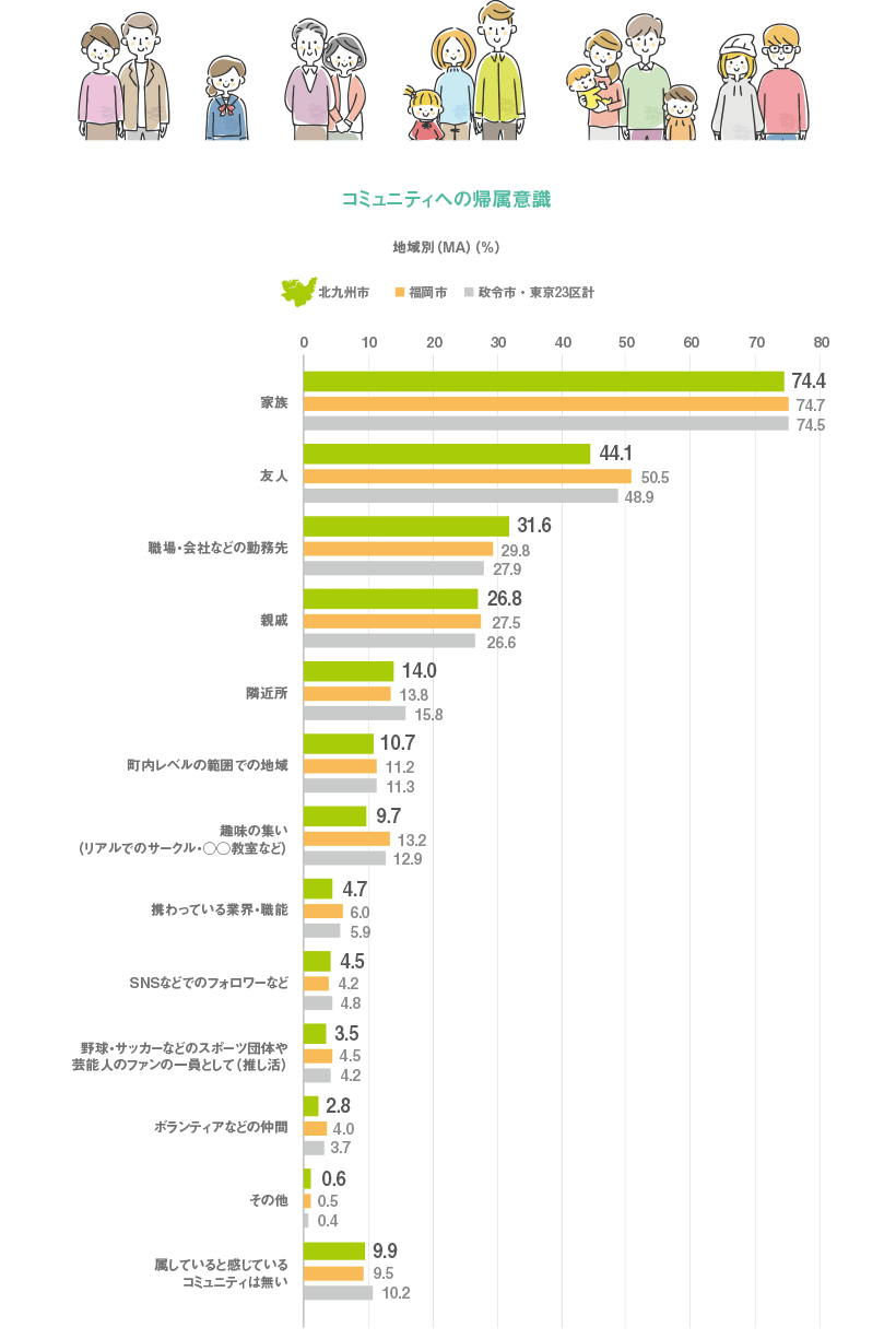 「次に挙げるコミュニティ(人々がつながり活動する集団)のうち、あなたがその集団に属しているという意識を持っているコミュニティをいくつでも選んでお知らせください」との質問には、北九州市では「家族」が74.4%で際立って高く、次いで「友人」「職場・会社などの勤務先 」「親戚」となっています。