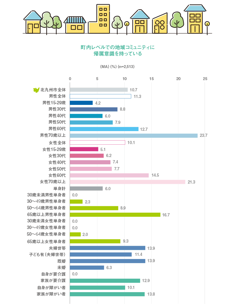 町内レベルでの地域コミュニティに帰属意識を持っている人は、北九州市全体では10.7%です。男性全体・女性全体では特に差はありませんが、年代別では年齢が高くなるほど帰属意識を持つ人が多くなる傾向が見られます。