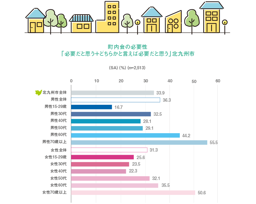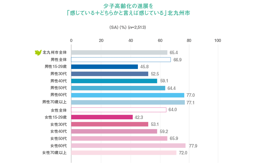 北九州市全体では、地域での少子高齢化を「感じている + どちらかと言えば感じている」が65.4%となっています。