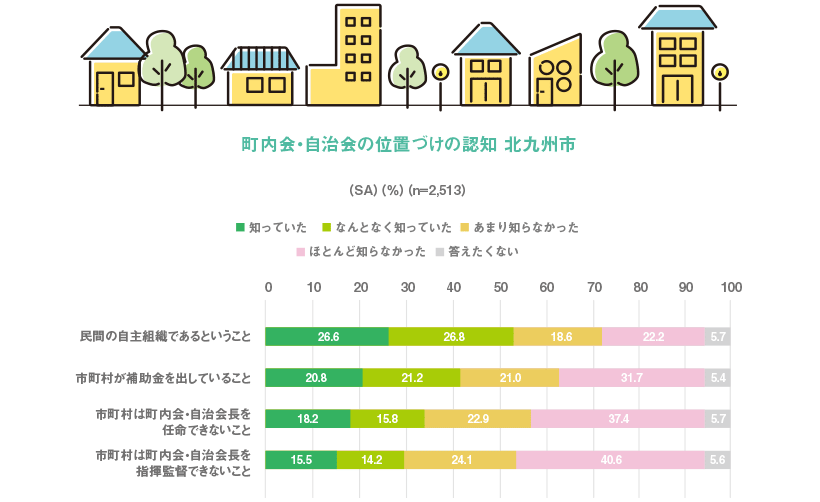 「町内会・自治会が民間の自主組織であるということ」を「知っていた+なんとなく知っていた」人は北九州市全体で53.4%、「市町村が町内会・自治会に補助金を出していること」は42.0%、「市町村は町内会・自治会長を任命できないこと」は34.0%、「市町村は町内会・自治会長を指揮監督できないこと」は29.7%となっています。