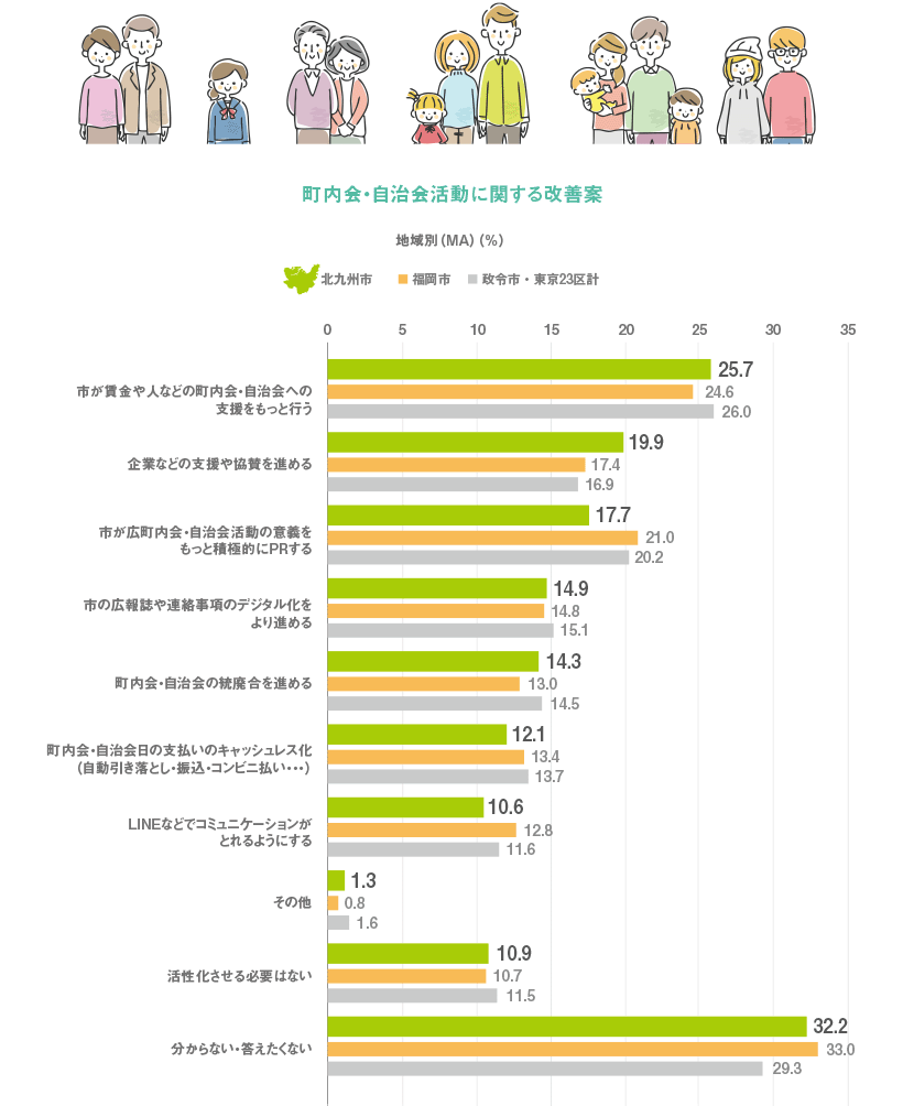 北九州市では「市が資金や人などの町内会・自治会への支援をもっと行う」が25.7%ともっとも高く、次いで「企業などの支援や協賛を進める」19.9%、「市が町内会・自治会活動の意義をもっと積極的にPRする」17.7%、「市の広報誌や連絡事項のデジタル化をより進める」14.9%、「町内会・自治会の統廃合を進める」14.3%などとなっています。 「活性化させる必要はない」は、10.9%と1割程度です。