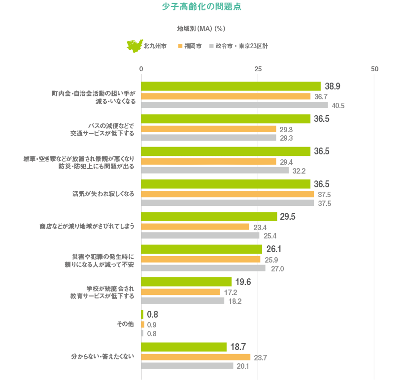 少子高齢化の問題点についてお聞きしたところ、北九州市では「町内会・自治会活動の担い手が減る・いなくなる」 38.9%、「バスの減便などで、交通サービスが低下する」「雑草・空き家などが放置され景観が悪くなり防災・防犯上にも問題が出る」「活気が失われ寂しくなる」が36.5%など、スコアが高くなっています。