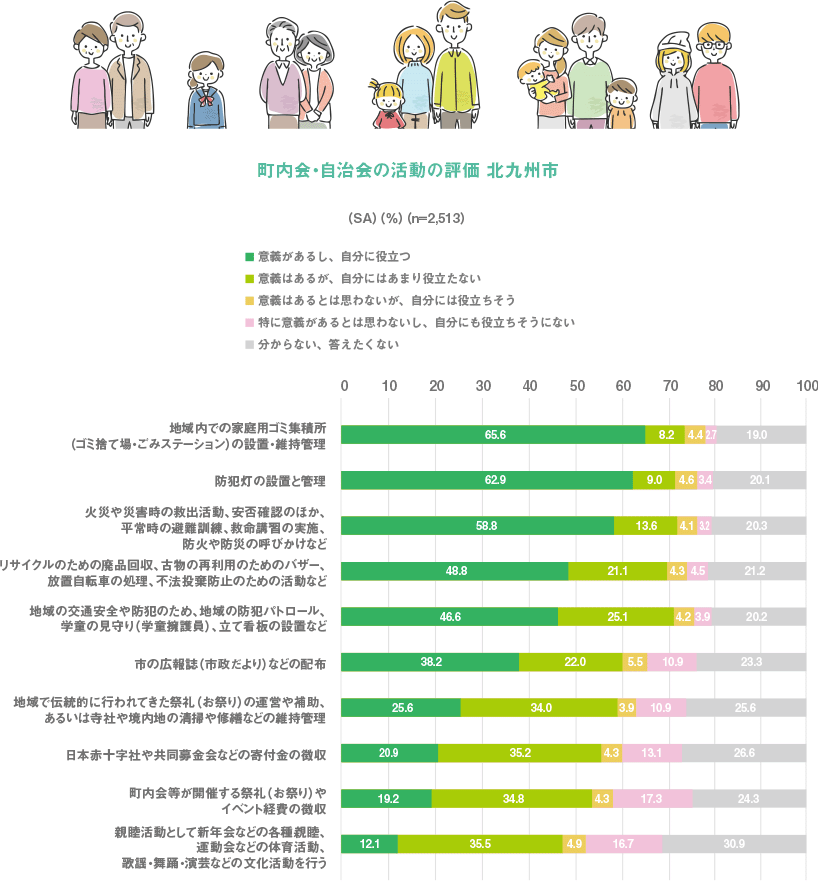逆に「伝統的な祭礼の運営・補助、寺社や境内地の維持管理」「寄付金の徴収」「町内会等が開催する祭礼・イベント経費の徴収」「親睦活動として新年会などの各種の親睦・運動会などの体育活動・歌謡舞踊・芸などの文化活動」などは、自分に役立たないとの評価( 意義はあるが、自分にあまり役立たない +特に意義があると思わないし、自分にも役立ちそうにない)が40%を超えています。