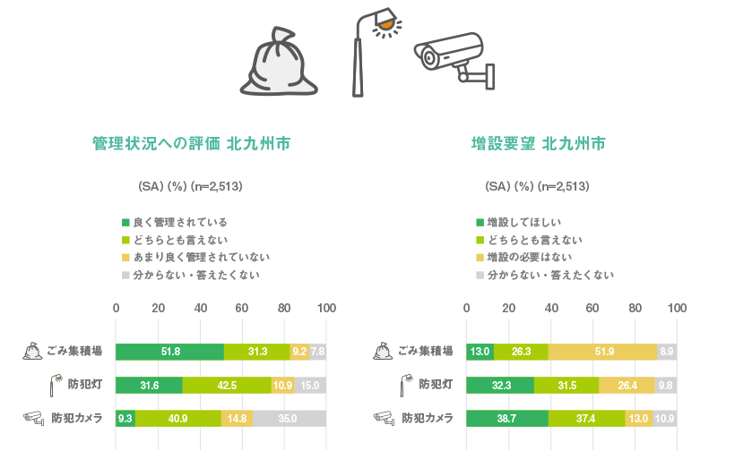 管理状況への評価と増設要望を見比べると、「評価の低い項目ほど増設要望が高い」という傾向が見られ、多数の市民はごみ集積場に関しては質量ともに一定の評価をしており、今後は防犯灯や監視カメラの拡充を求めていることが分かります。